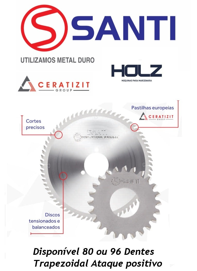 O conjunto Santi para esquadrejadeiras Holz inclui disco de serra com 80 dentes (3,20 mm de espessura) e riscador calibrado com corte de 3,10 mm, garantindo alinhamento perfeito e evitando vãos entre a chapa e a fita de borda.